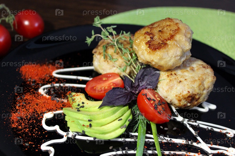 Куриные котлеты подаются с авокадо, томатами и специями на черной тарелке