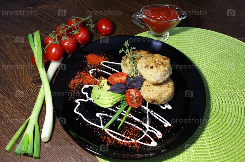Куриные котлеты подаются на черной тарелке, украшены авокадо, помидорами, зеленью и специями