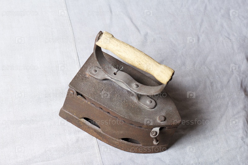 Старый утюг, нагретый горячими углями. Расположен на льняной ткани