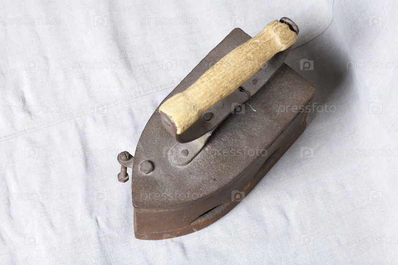 Старый утюг, нагретый горячими углями. Расположен на льняной ткани