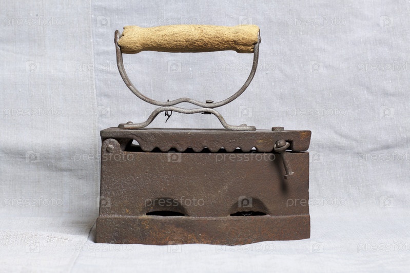 Старый утюг, нагретый горячими углями. Расположен на льняной ткани