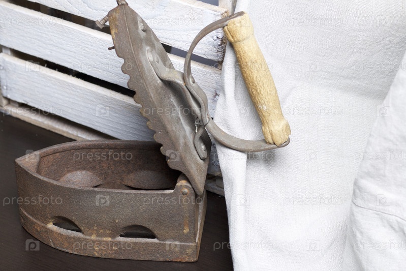Старый утюг, нагретый горячими углями. Открытый угольный отсек. Стоит рядом с деревянным ящиком и льняной тканью