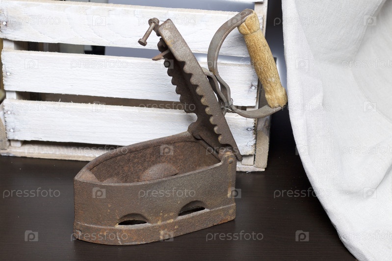 Старый утюг, нагретый горячими углями. Открытый угольный отсек. Стоит рядом с деревянным ящиком и льняной тканью