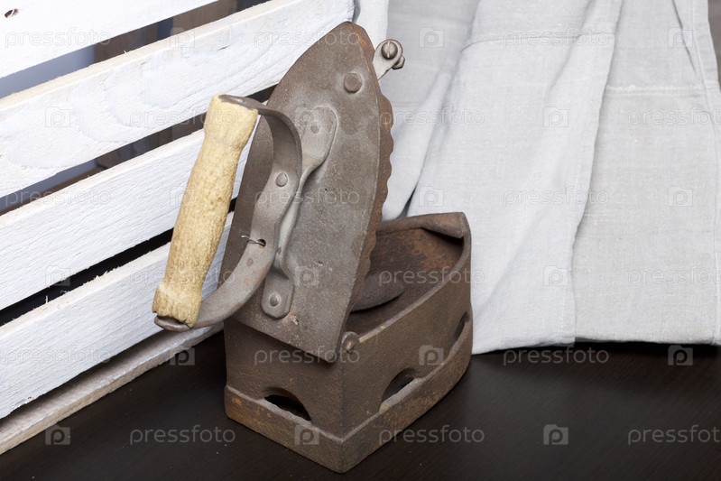 Старый утюг, нагретый горячими углями. Открытый угольный отсек. Стоит рядом с деревянным ящиком и льняной тканью