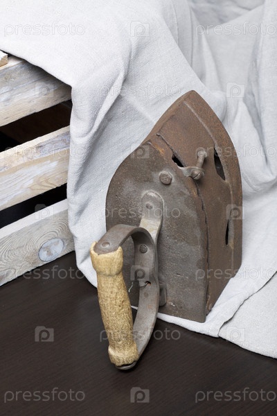 Старый утюг, нагретый горячими углями. Стоит рядом с деревянным ящиком
