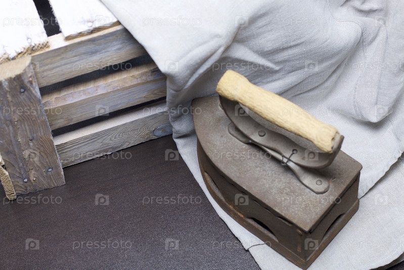 Старый утюг, нагретый горячими углями. Стоит рядом с деревянным ящиком