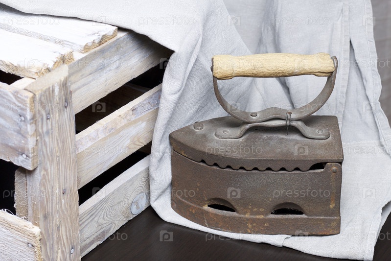 Старый утюг, нагретый горячими углями. Стоит рядом с деревянным ящиком