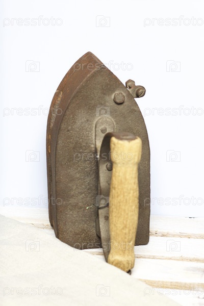 Старый утюг, нагретый горячими углями. Расположен на деревянном ящике