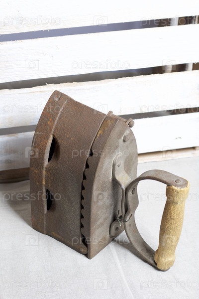 Старый утюг, нагретый горячими углями. Расположен на фоне деревянного ящика
