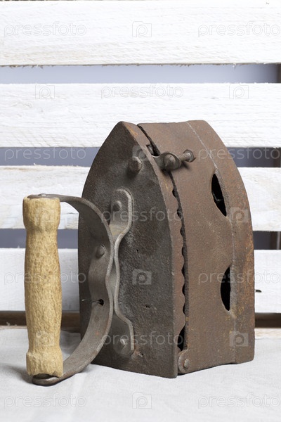 Старый утюг, нагретый горячими углями. Расположен на фоне деревянного ящика