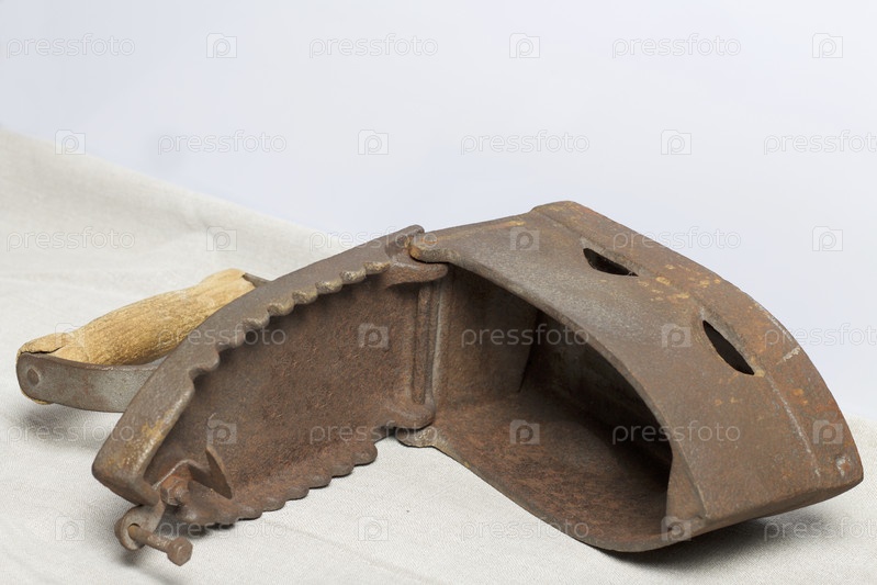 Старый утюг, нагретый горячими углями. Открытый угольный отсек. Расположен на льняной ткани