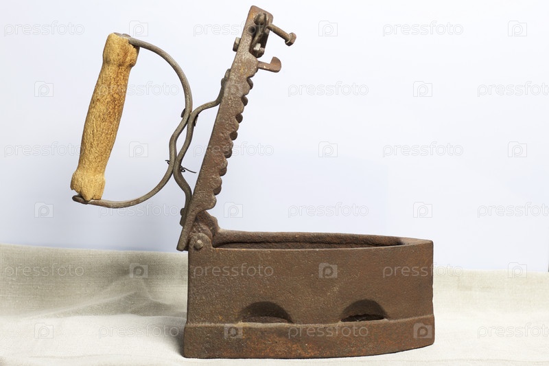 Старый утюг, нагретый горячими углями. Открытый угольный отсек. Расположен на льняной ткани