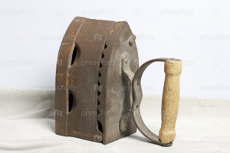 Старый утюг, нагретый горячими углями. Расположен на льняной ткани