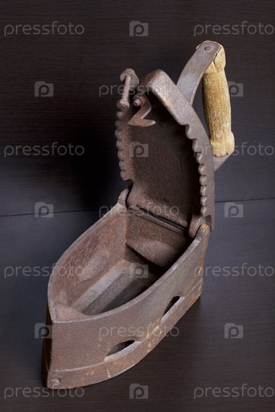 Старый утюг, нагретый горячими углями. Открытый угольный отсек. Расположен на темном фоне