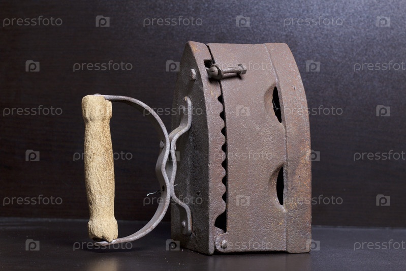 Старый утюг, нагретый горячими углями. Расположен на темном фоне