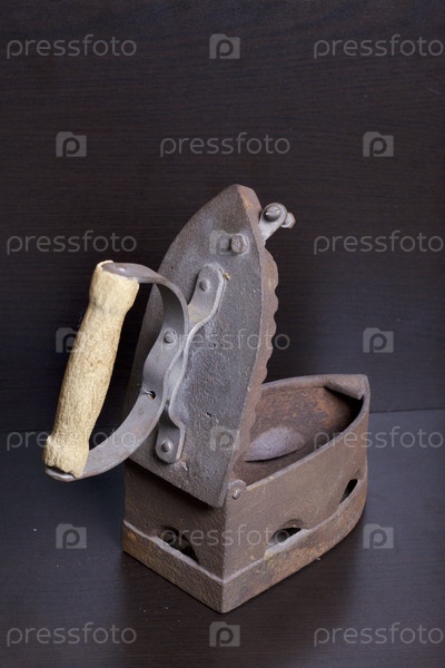 Старый утюг, нагретый горячими углями. Открытый угольный отсек. Расположен на темном фоне