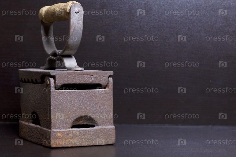 Старый утюг, нагретый горячими углями. Расположен на темном фоне