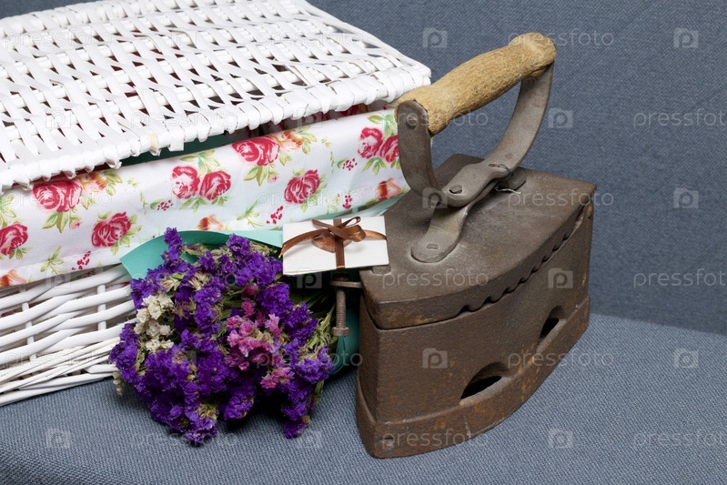 Старый утюг, нагретый горячими углями. Расположен на серой ткани. Рядом плетеные корзины, букет сухоцветов и поздравительная открытка