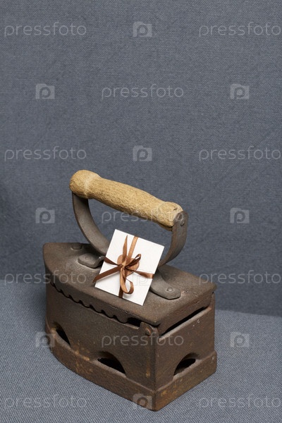 Старый утюг, нагретый горячими углями. Рядом поздравительная открытка