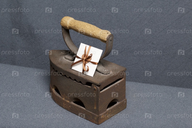 Старый утюг, нагретый горячими углями. Рядом поздравительная открытка