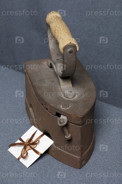 Старый утюг, нагретый горячими углями. Рядом поздравительная открытка