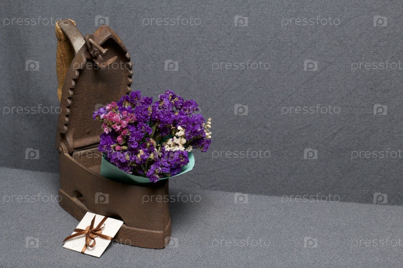 Старый утюг, нагретый горячими углями. В слегка приоткрытый утюг вложен букет сухоцветов. Рядом — поздравительная открытка