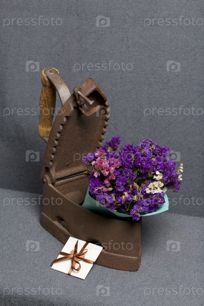 Старый утюг, нагретый горячими углями. В слегка приоткрытый утюг вложен букет сухоцветов. Рядом — поздравительная открытка