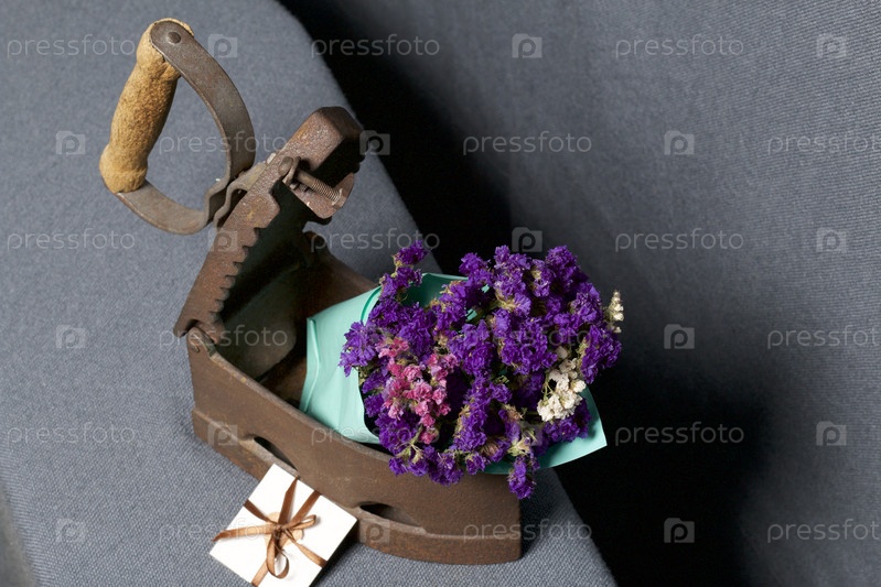 Старый утюг, нагретый горячими углями. В слегка приоткрытый утюг вложен букет сухоцветов. Рядом — поздравительная открытка