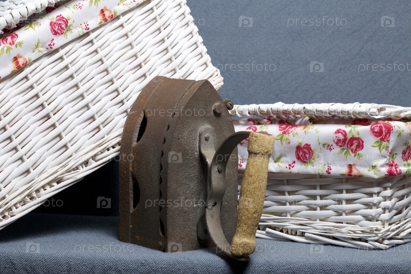 Старый утюг, нагретый горячими углями. Расположен на серой ткани. Рядом плетеные корзины