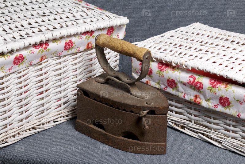 Старый утюг, нагретый горячими углями. Расположен на серой ткани. Рядом плетеные корзины