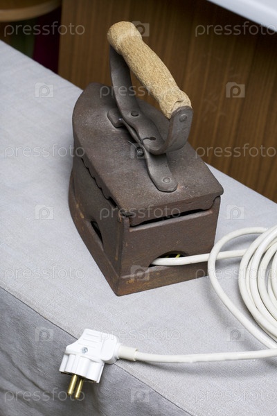 Старый утюг, нагретый горячими углями. Расположен на льняной ткани. Виден шнур с вилкой. Коллаж