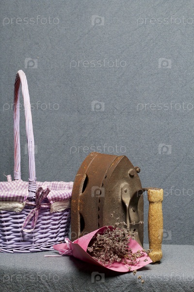Старый утюг, нагретый горячими углями. Расположен около плетеных корзин. Около букета сухоцветов