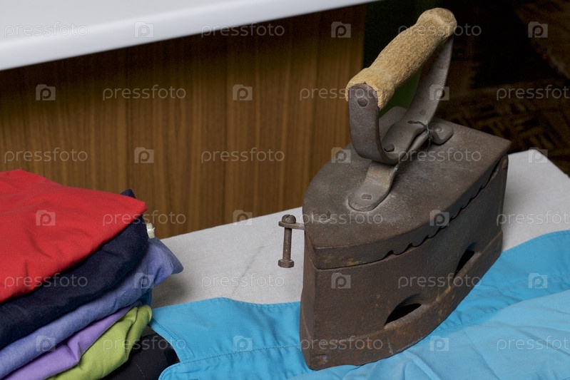 Старый утюг, нагретый горячими углями. Расположен на льняной ткани. Стоит на гладильной доске. Рядом со стопкой нераздетых рубашек