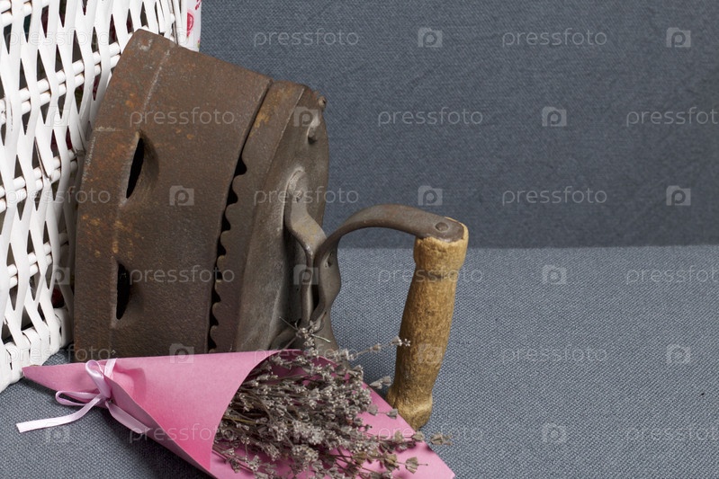 Старый утюг, нагретый горячими углями. Расположен около плетеных корзин. Около букета сухоцветов