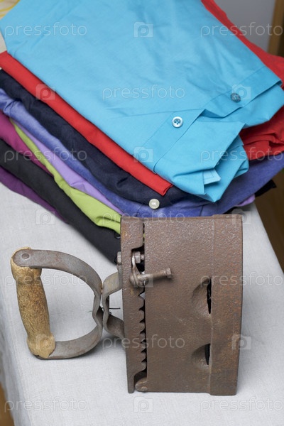 Старый утюг, нагретый горячими углями. Расположен на льняной ткани. Стоит на гладильной доске. Рядом со стопкой нераздетых рубашек