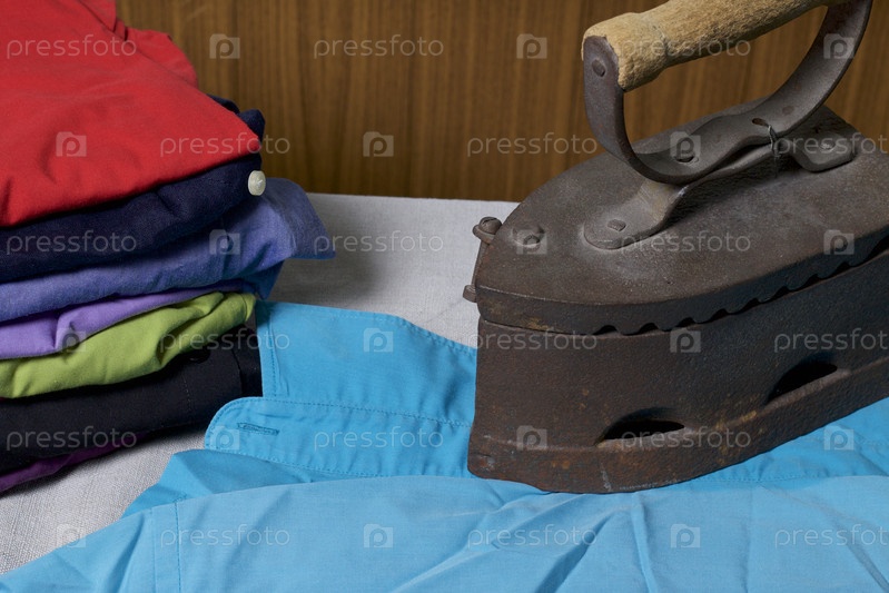 Старый утюг, нагретый горячими углями. Расположен на льняной ткани. Стоит на гладильной доске. Рядом со стопкой нераздетых рубашек
