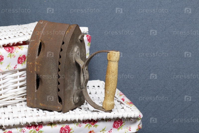 Старый утюг, нагретый горячими углями. Расположен на плетеных корзинах