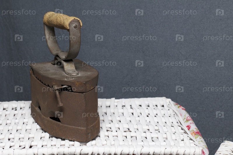 Старый утюг, нагретый горячими углями. Расположен на плетеных корзинах