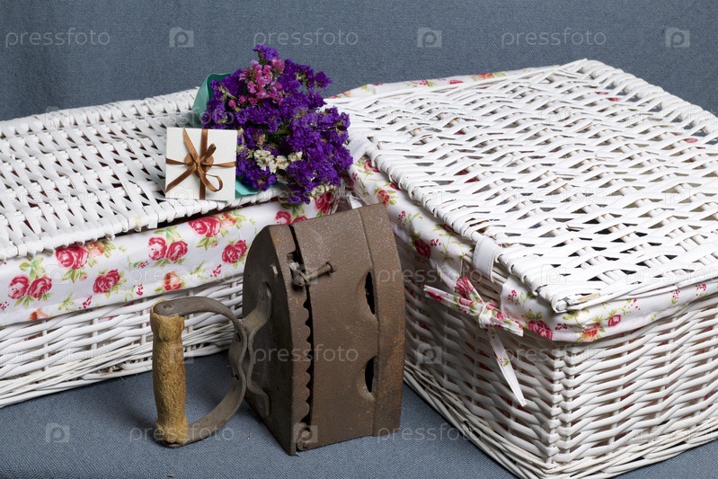 Старый утюг, нагретый горячими углями. Расположен на серой ткани. Рядом плетеные корзины, букет сухоцветов и поздравительная открытка