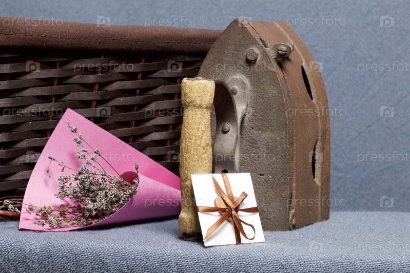 Старый утюг, нагретый горячими углями. Расположен на серой ткани. Рядом плетеные корзины, букет сухоцветов и поздравительная открытка