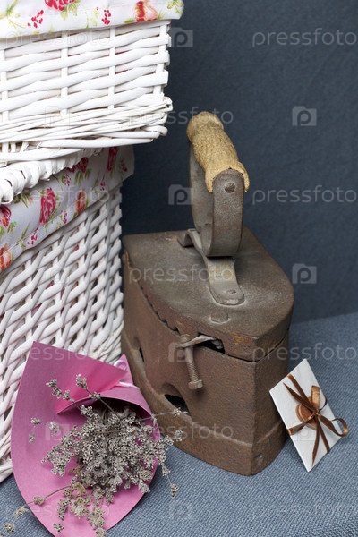 Старый утюг, нагретый горячими углями. Расположен на серой ткани. Рядом плетеные корзины, букет сухоцветов и поздравительная открытка
