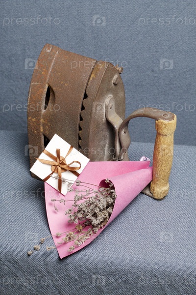 Старый утюг, нагретый горячими углями. Расположен на серой ткани. Рядом плетеные корзины, букет сухоцветов и поздравительная открытка