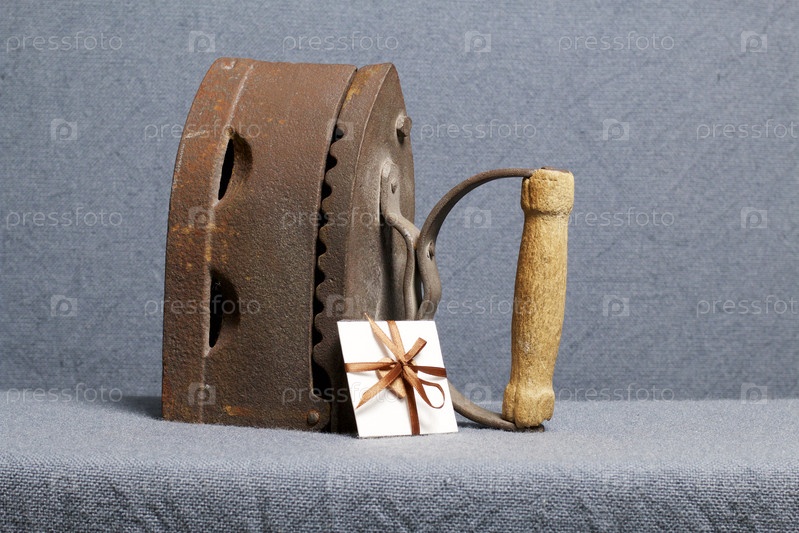 Старый утюг, нагретый горячими углями. Расположен на серой ткани. Рядом поздравительная открытка