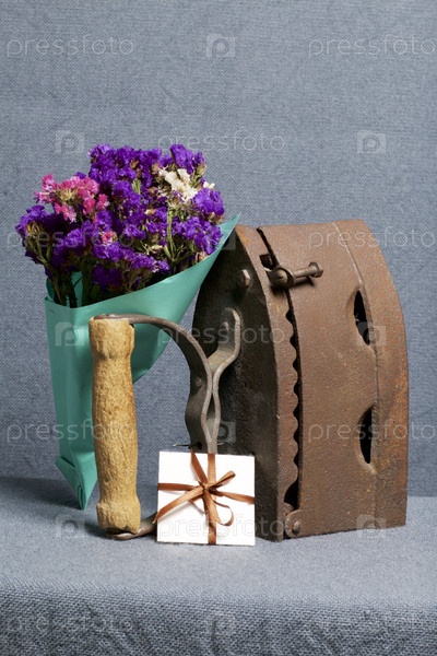 Старый утюг, нагретый горячими углями. Расположен на серой ткани. Рядом букет сухоцветов и поздравительная открытка