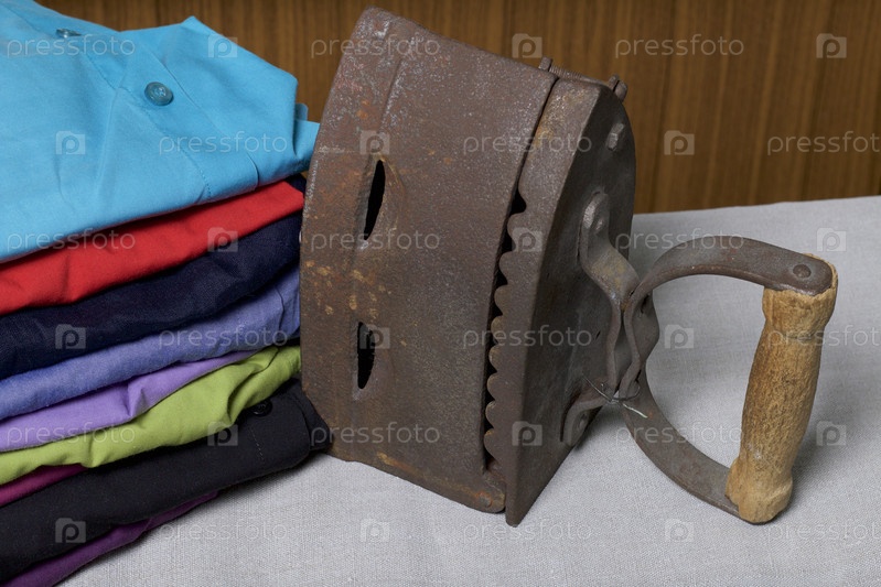Старый утюг, нагретый горячими углями. Расположен на льняной ткани. Стоит на гладильной доске. Рядом со стопкой нераздетых рубашек