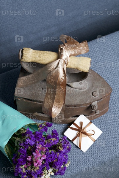 Старый утюг, нагретый горячими углями. Расположен на серой ткани. Рядом букет сухоцветов и поздравительная открытка