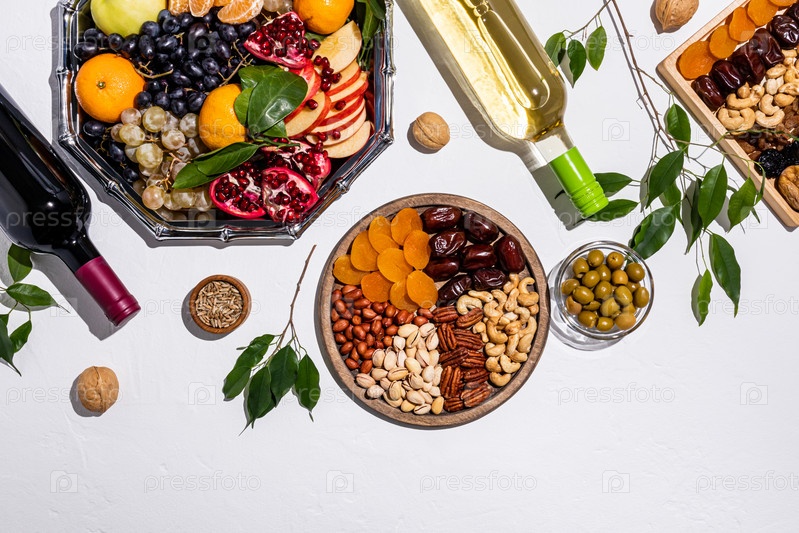 Красивый праздничный фон для еврейского праздника Ту Би Шват с ассортиментом сухофруктов, орехов, красного и белого вина. Вид сверху. Плоская планировка