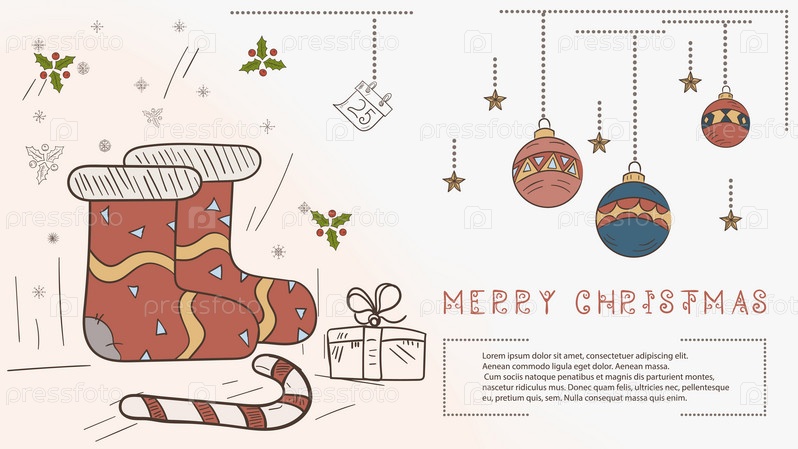 Рождественская цветовая контурная иллюстрация в стиле детских каракулей с текстом Lorem Ipsum Связанные теплые носки со сладостями