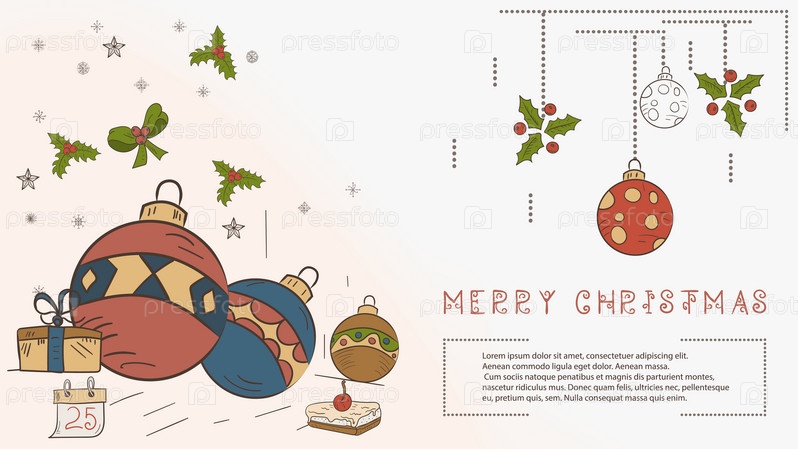 Рождественская цветовая контурная иллюстрация в стиле детских каракулей с текстом Lorem Ipsum Рождественные шары