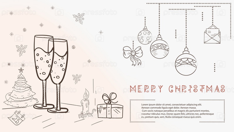 Рождественская контурная иллюстрация в стиле детских каракулей с текстом Lorem Ipsum стакан напитка